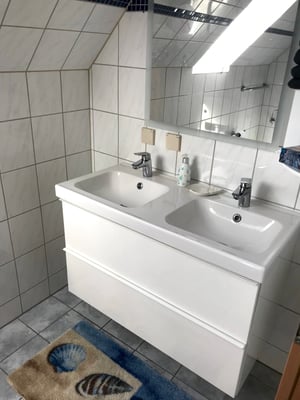 Das Bad hat einen modernen doppelten Waschtisch mit großem Spiegel mit LED-Licht sowie eine Dusche und WC. Handtücher und Bettwäsche sind inklusive.